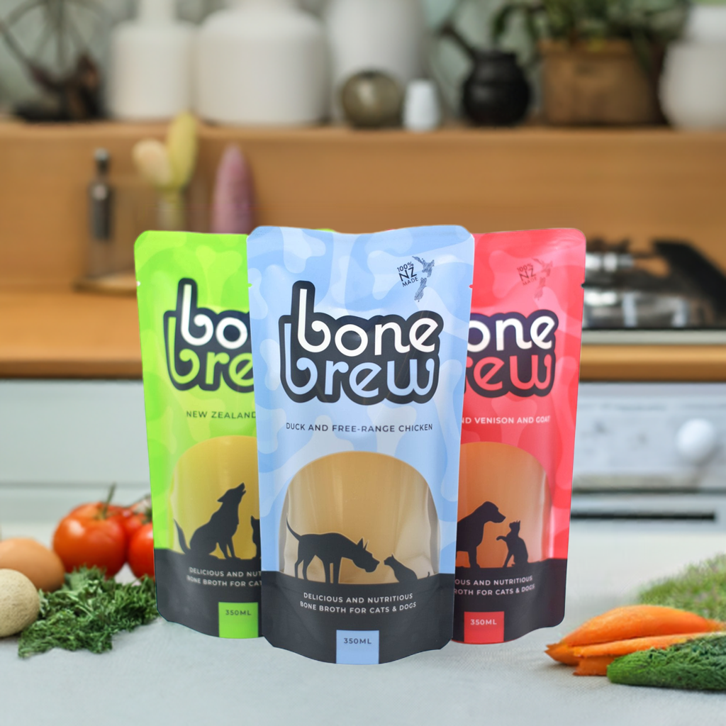 Our Duck & Chicken Bone Brew is a fan favorite among pets. Made from premium New Zealand duck and chicken bones, this broth is rich in collagen and essential nutrients. Perfect for promoting joint health and a shiny coat, this brew is a delicious way to keep your furry friends happy and healthy.